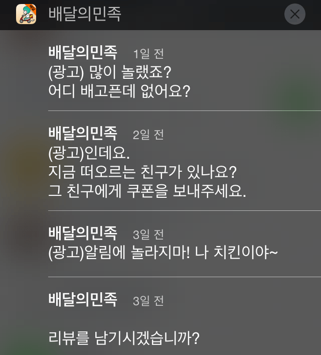 막 하는 듯 키치하면서도 섬세한 마케팅으로 늘 극찬을 받아온 배달의민족다운 발상이다. 이미 다 만들어놓은 푸시 메시지에 “(광고)”문구를 자동적으로 얹은 것이 아니라 “(광고)” 문자 자체를 푸시 메시지에 반영해 작성하는 것이다. “광고 알림에 놀라지마!”는 물론이고 “광고인데요..”라며 자신은 광고성 메시지가 맞다는 자조 섞인(?) 메시지도 발송했다.