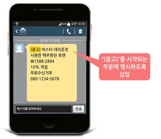 개정된 법이 시행되면서 한국인터넷진흥원에서 공개한 안내서에 따르면, 전화, SMS, MMS, 게시판 글, 이메일, 푸시 알림 등 정보통신망을 통해 광고성 메시지 발송할 때 반드시 “(광고)” 문자를 넣어둬야 한다.