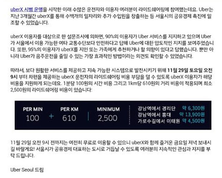 기사들에게 위와 같은 메시지가 발송된 지 3시간 후인 오후 6시쯤. Uber 이용자들에게 유료화 공지 이메일이 발송됐다. 하지만 이 이메일을 모든 Uber 회원이 받은 것은 아니다. 평소 Uber를 많이 이용하는 일부 헤비 유저를 중심으로만 메일이 발송됐고 대부분의 Uber 회원은 유료화 소식을 접하지 못했다.