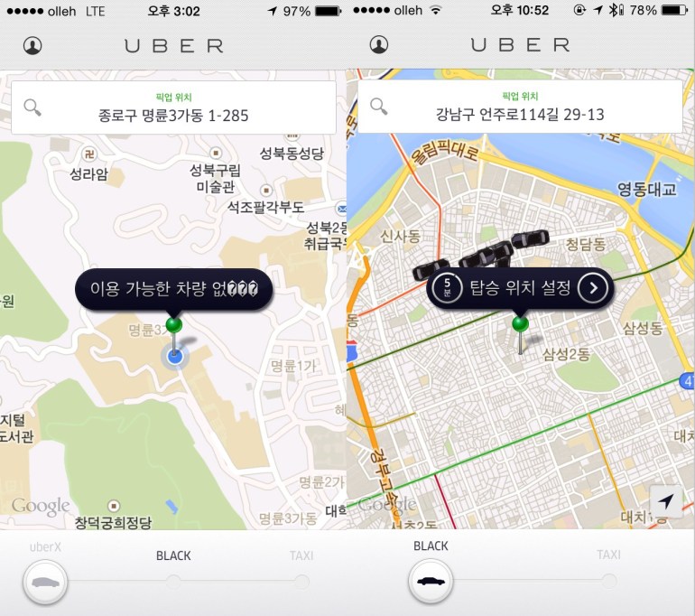 Uber의 사전 공지대로 29일 아침부터 일반 회원은 Uber 앱 상에서 uberX를 볼 수 없는 상태가 되었다. 공지를 접하지 못한 회원은 단순 오류로 인식할 수도 있는 노출 방식이다.