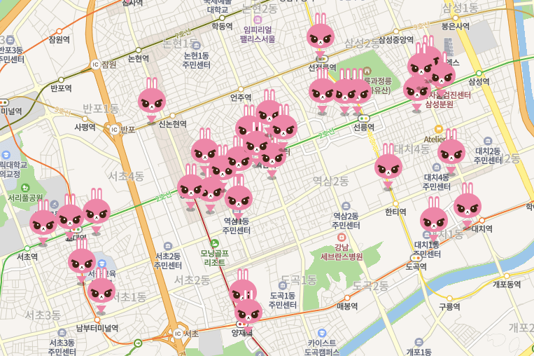 바나프레소의 출점 형태를 보면 감탄을 금할 수 없다. 자주 사용하는 지도 앱을 열어 ‘바나프레소’를 검색해보자. 전체 47개 점포 중에 무려 35개의 점포가 강남구와 서초구에 위치해 있고, 모든 지점의 200m 내에 다른 바나프레소 지점이 있다. 몇 안되는 비강남권 점포들도 고작 한 두블럭을 사이에 두고 떨어져 있고, 심지어 강남역과 역삼역 반경 600m 내에는 11개의 바나프레소 지점이 몰려있다. 강남에 밀집해 있기로 유명한 스타벅스보다도 더 높은 밀도로 점포를 만들고 있는 것이다.
