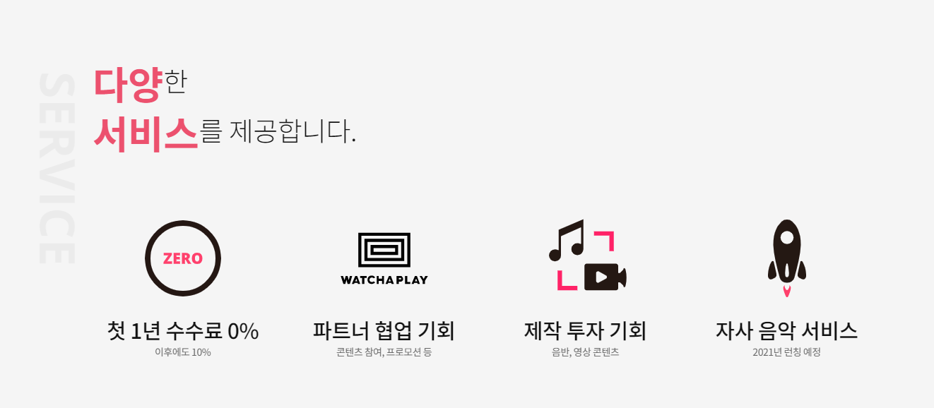 어제 왓챠가 자회사 더블유피어를 설립하면서 음원 유통 사업을 시작한다고 밝혔고, 스트리밍 서비스에 대해서는 검토 중이라고 선을 그었다. 공식 웹사이트에 밝힌 내용들을 보면 저작권자들 입장에서는 한참 부족한 어필 포인트들이고 하나 같이 아쉽다.
