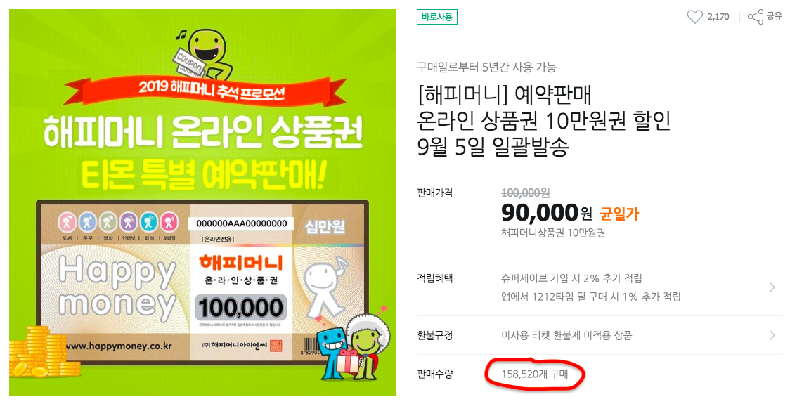 8월 20일, 티몬이 해피머니 문화상품권 10만원권을 9만원에 올렸다. 10% 할인율로 판매를 진행한 건데, 일반적으로 상품권을 8% 이상의 할인율로 판매하면 '핫딜'로 본다. 일반적인 핫딜보다 높은 할인율인 것을 보면 아마 노마진 혹은 마이너스 마진으로 추정되는 조건. 심지어 신용카드로 구매 가능한 조건이어서 알뜰구매러 사이에서는 크게 입소문이 났고, 이 핫딜로 무려 150억원 어치를 팔았다.